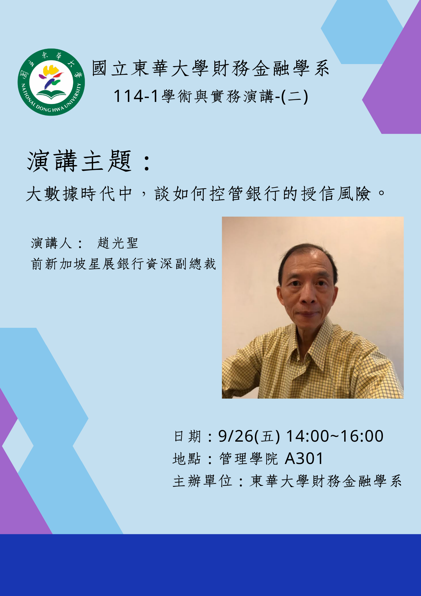 敬邀參與財金系114學年度第1學期第2次學術專題演講,本次演講訊息如下: