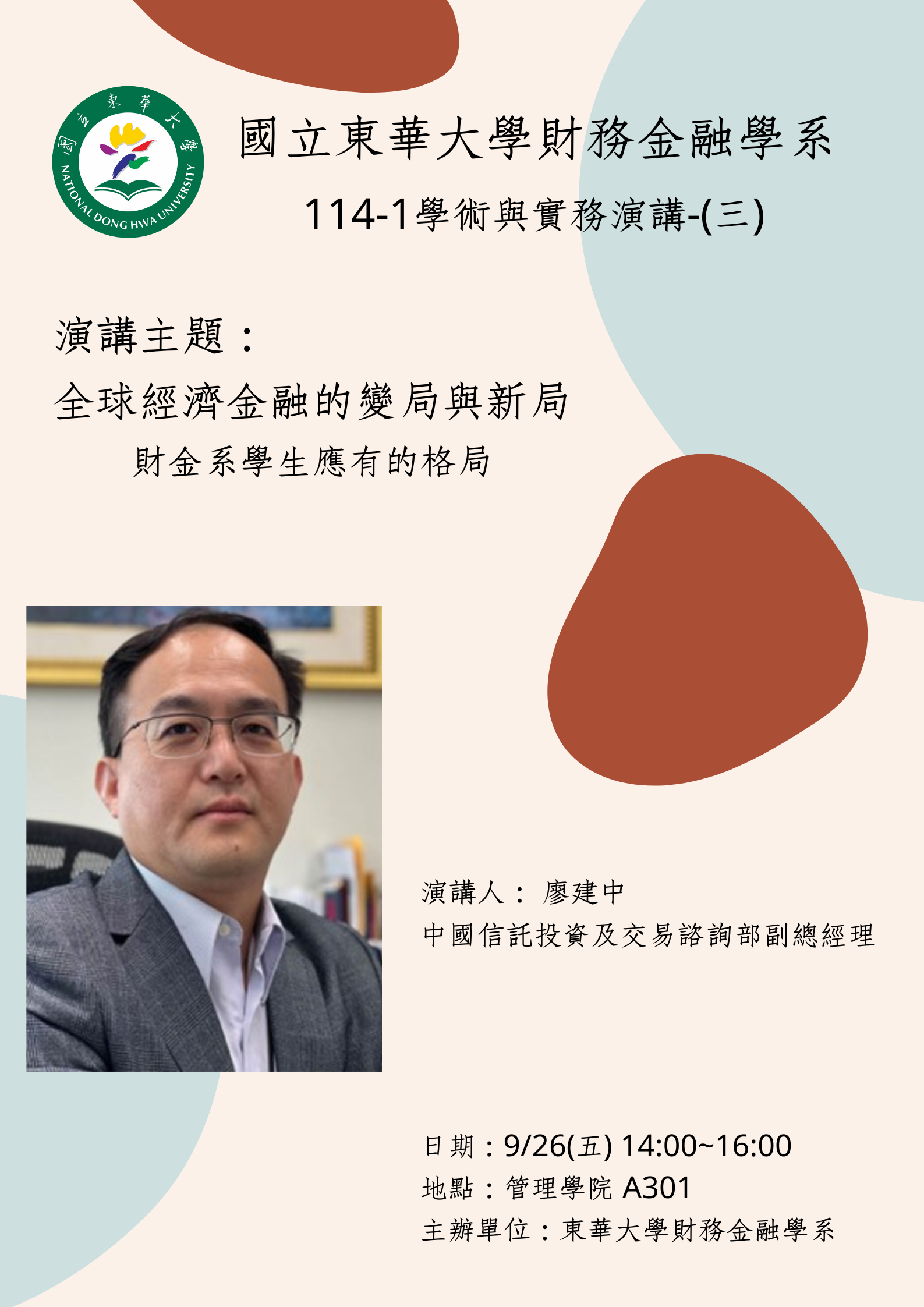 敬邀參與財金系114學年度第1學期第3次學術專題演講,本次演講訊息如下: