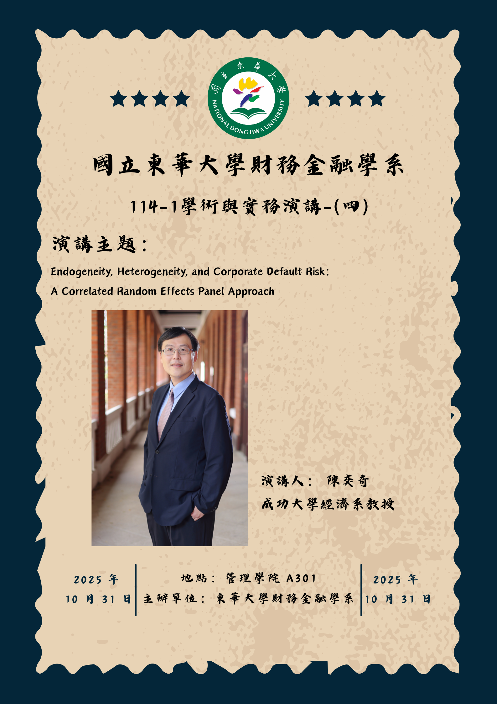 一. 演講主題:Endogeneity, Heterogeneity, and Corporate Default Risk: A Correlated Random Effects Panel Approach